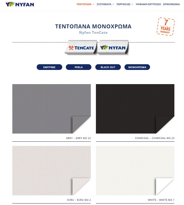 Τα μονόχρωμα τεντόπανα σκίασης Nyfan TenCate προσφέρουν μια ευρεία γκάμα χρωματικών επιλογών κατάλληλα για χώρους επαγγελματικούς αλλά και οικιακούς. Η συλλογή αποτελείται από μοντέρνα χρώματα που δίνουν στον χώρο σας χαρακτήρα απλό και λιτό ενώ παράλληλα προσφέρουν 100% αδιαβροχία και υψηλή προστασία ακόμη και από ακραία καιρικά φαινόμενα. Το ζωντανό τους χρώμα είναι αποτέλεσμα της διπλής επίστρωσης των ακρυλικών χρωμάτων που χρησιμοποιούνται κατά την επεξεργασία τους. Επιλέξτε το μονόχρωμο που ταιριάζει στον δικό σας χώρο ανάμεσα από μια χρωματική παλέτα 12 ξεχωριστών αποχρώσεων. Το χρώμα της εξωτερικής πλευρά της τέντας μπορεί να είναι είναι ίδιο ή διαφορετικό από το εσωτερικό μιας και περνούν διαδικασία διπλής επίστρωσης κατά την οποία αποκτούν και τον εκάστοτε χρωματισμό.