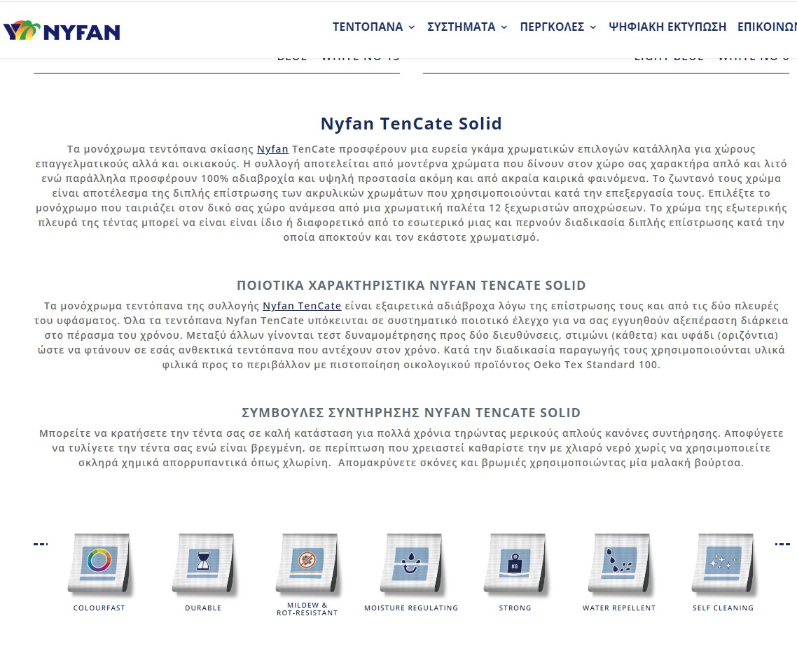 Τα μονόχρωμα τεντόπανα της συλλογής Nyfan TenCate είναι εξαιρετικά αδιάβροχα λόγω της επίστρωσης τους και από τις δύο πλευρές του υφάσματος. Όλα τα τεντόπανα Nyfan TenCate υπόκεινται σε συστηματικό ποιοτικό έλεγχο για να σας εγγυηθούν αξεπέραστη διάρκεια στο πέρασμα του χρόνου. Μεταξύ άλλων γίνονται τεστ δυναμομέτρησης προς δύο διευθύνσεις, στιμώνι (κάθετα) και υφάδι (οριζόντια) ώστε να φτάνουν σε εσάς ανθεκτικά τεντόπανα που αντέχουν στον χρόνο. Κατά την διαδικασία παραγωγής τους χρησιμοποιούνται υλικά φιλικά προς το περιβάλλον με πιστοποίηση οικολογικού προϊόντος Oeko Τex Standard 100.