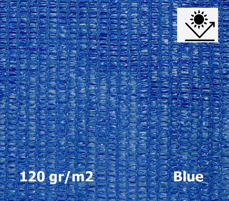 Δίχτυ σκίασης 120gr/m2 σε μπλε χρώμα, υψηλής αντοχής από 100% πολυαιθυλένιο HDPE και με σταθεροποίηση UV έναντι της ηλιακής ακτινοβολίας για 5 έτη.