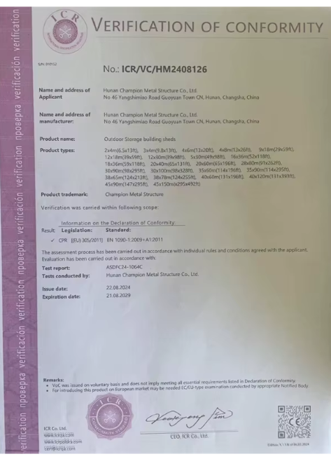 Εγγύηση: Το υπόστεγο θα είναι υπό εγγύηση για την περίοδο 1 έτους για την κάλυψη ελαττωμάτων σε σχεδιασμού και κατασκευής της γαλβανισμένης χαλύβδινης κατασκευής, του υφασμάτινου καλύμματος και του του μηχανισμού συνδέσεων του υφάσματος και του χάλυβα. Κανονική φθορά και βλάβη από από τον αγοραστή αποκλείονται. Σύστημα κάλυψης στέγης 900gsm pvc/PVDF ύφασμα με διπλή επικάλυψη για κάλυψη στέγης CE Conformité Européene (European Conformity): indicates conformity with health, safety and environmental protection standards for products sold within the European Economic Area.