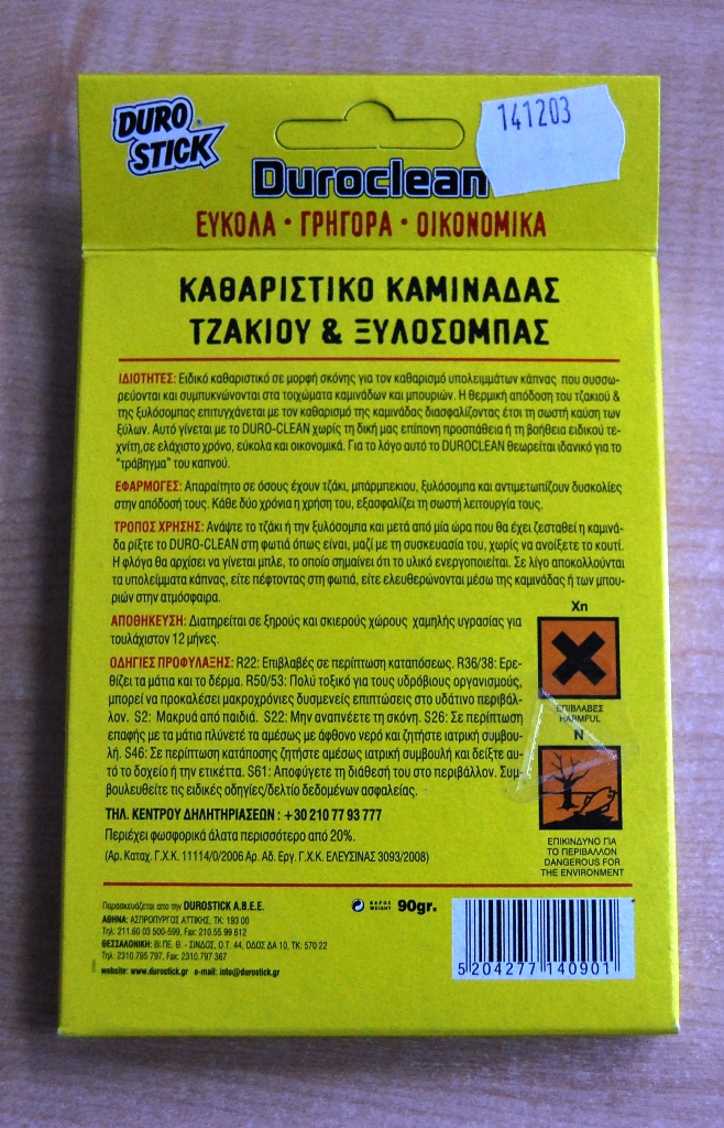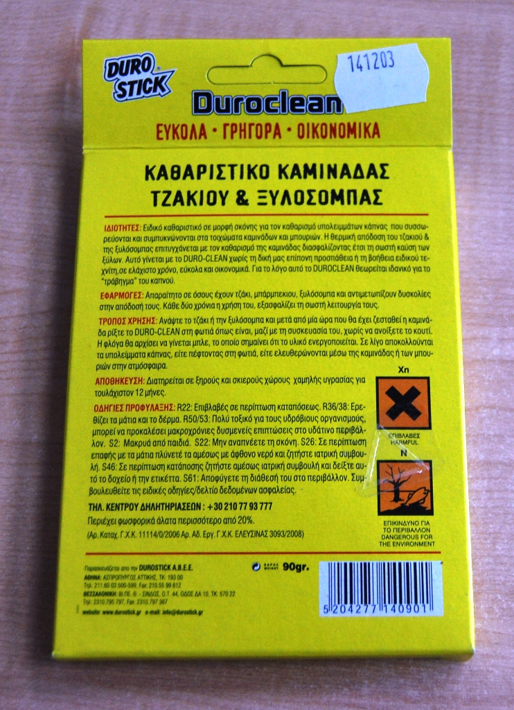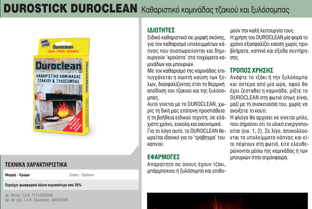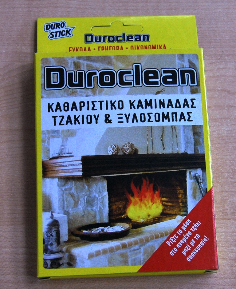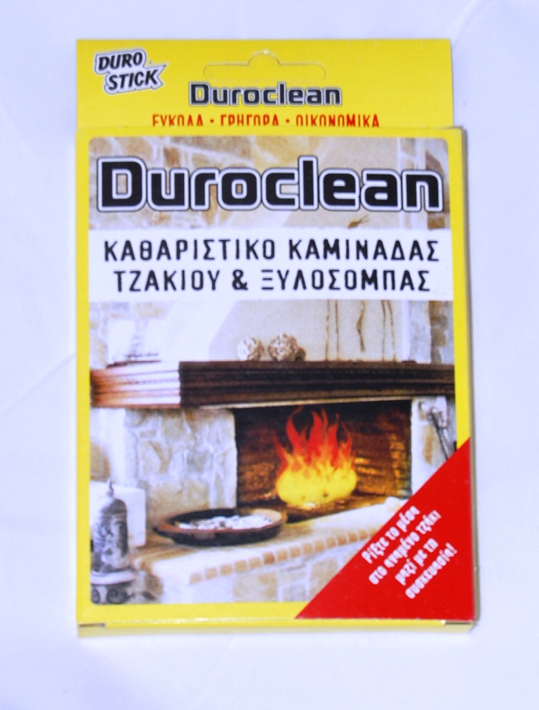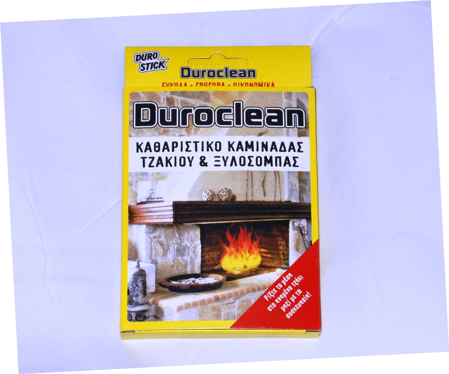 duroclean καθαριστικό καμινάδων, σομπών, τζακιών Ειδικό καθαριστικό σόμπας και τζακιού σε μορφή σκόνης, για τον καθαρισμό υπολειμμάτων κάπνας που συσσωρεύονται και συμπυκνώνονται στα τοιχώματα καμινάδων και μπουριών. Με τον καθαρισμό της καμινάδας επιτυγχάνεται η σωστή καύση των ξύλων, διασφαλίζοντας έτσι τη θερμική απόδοση του τζακιού και της ξυλόσομπας.Αυτό γίνεται με το DUROCLEAN, χωρίς τη δική μας επίπονη προσπάθεια ή τη βοήθεια ειδικού τεχνίτη, σε ελάχιστο χρόνο, εύκολα και οικονομικά. Για το λόγο αυτό, το DUROCLEAN θεωρείται ιδανικό για το «τράβηγμα» του καπνού.Απαραίτητο σε όσους έχουν τζάκι, μπάρμπεκιου ή ξυλόσομπα και επιθυμούν την καλή λειτουργία τους. Η χρήση του DUROCLEAN μια φορά τον χρόνο εξασφαλίζει καύση χωρίς προβλήματα, καπνιά και έξοδα συντήρησης.Ανάψτε το τζάκι ή την ξυλόσομπα και ύστερα από μία ώρα, αφού θα έχει ζεσταθεί η καμινάδα, ρίξτε το DUROCLEAN στη φωτιά όπως είναι, μαζί με τη συσκευασία του, χωρίς να ανοίξετε το κουτί.Η φλόγα θα αρχίσει να γίνεται μπλε, που σημαίνει ότι το υλικό ενεργοποιείται. Σε λίγο, αποκολλούνται τα υπολείμματα κάπνας και είτε πέφτουν στη φωτιά, είτε ελευθερώνονται μέσω της καμινάδας ή των μπουριών στην ατμόσφαιρα.Το προϊόν χαρακτηρίζεται ως επιβλαβές. Συνιστάται να διατηρείται μακριά από παιδιά. Πριν από τη χρήση συμβουλευτείτε τις οδηγίες προφύλαξης στην ετικέτα του προϊόντος ή στο έντυπο δεδομένων ασφαλείας.