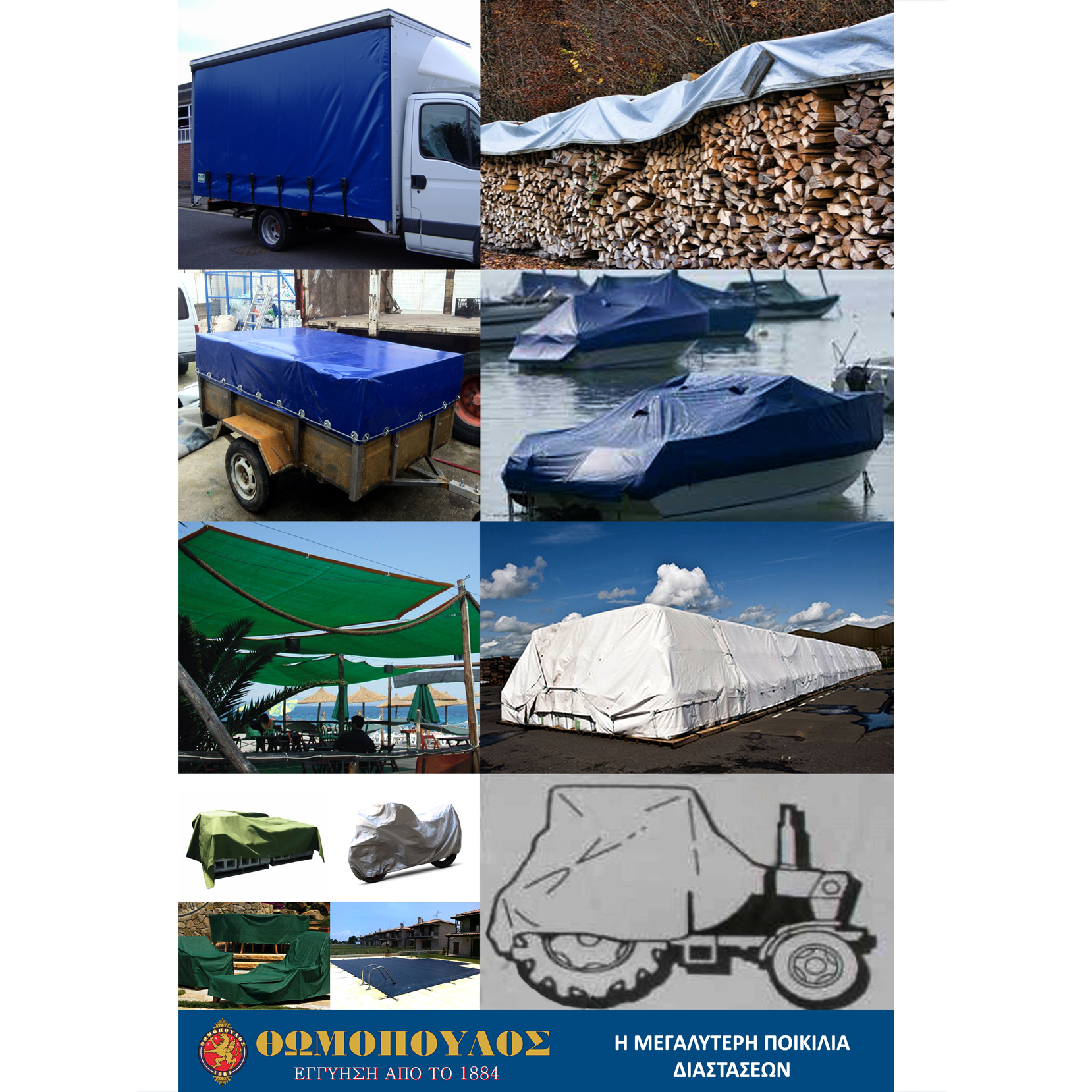 Αδιάβροχος, πολύ ανθεκτικός μουσαμάς κατάλληλος για την προστασία σκαφών, αντικειμένων, εμπορευμάτων,ξύλων κ.α. από τις καιρικές συνθήκες όπως τη βροχή, την υγρασία και τον ήλιο.